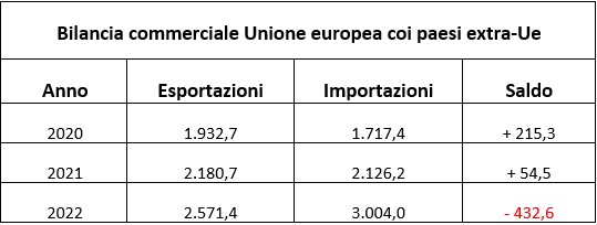 Nel frattempo l’economia degli Stati Uniti è in crescita e la sua bilancia commerciale, grazie anche all’esportazione di Gnl in Europa, secondo le previsioni del Fmi, registrerà il più basso deficit da tre anni a questa parte. Evidentemente a qualcuno la guerra giova… Non certo all’Unione Europea, che nel 2022 ha avuto un saldo commerciale negativo, arrivando a -432,6 miliardi di euro, dai +54,5 dell’anno precedente e, addirittura, dai +215,3 del 2020 (tabella 3), a causa dell’aumento della bolletta energetica, gas in primis.