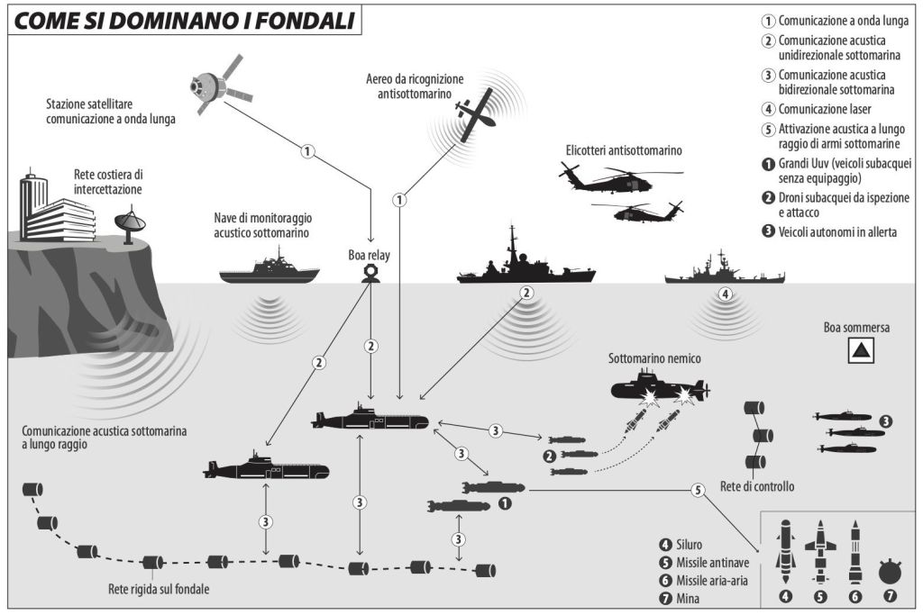 Nella seconda parte si trovano notevoli approfondimenti sulle arterie dell’energia e della rete messe in evidenza dal saggio di Manfredi Cartocci e Matteo Palmieri, Come si domina la dimensione subacquea, che illustra la seabed war (l’insieme delle attività militari messe in campo per proteggere le infrastrutture subacquee da qualunque tipologia di minaccia, inclusa la prevenzione di sabotaggi e di attività d’intelligence), e su La nuova frontiera dello spionaggio spaziale di Marcello Spagnulo, che ci informa dell’enorme massa di satelliti che, a opera di imprese private, circolano sulla nostra testa.