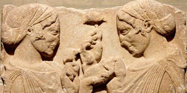 Sull’altro versante vediamo la solidarietà del mondo femminile, legato alla natura, affascinato dalla bellezza, animato da com-passione, fragile fisicamente, eppure forte della capacità di dare la vita. Il gesto della serva, a volte chiamata Iambe, a volte Baubò, che riesce a far ridere Demetra, viene rappresentato anche nella pittura vascolare e negli ex-voto. Igino, un mitografo romano, lo fa risalire a una vicenda diversa: racconta che ad Atene non fosse consentito alle donne imparare l’arte medica e che le partorienti, rifiutando per pudore medici maschi, morivano in quantità. Finché una ragazza, Agnodice, decise di fingersi uomo e cominciò a praticare l’ostetricia con successo; tranne poi essere costretta a mostrare le sue parti intime nel tribunale dell’Areopago, per liberarsi dall’accusa di approfittare del suo lavoro per sedurre le sue pazienti.