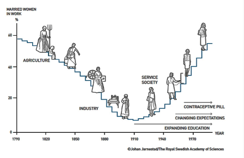 L’economista del Gender Gap dimostra che questa partecipazione non ha avuto una tendenza costante all’aumento, ma ha invece formato una curva a U, con la presenza delle donne sposate in calo nella transizione dalla società agricola a quella industriale all’inizio del diciannovesimo secolo, seguita nel Novecento da un aumento della crescita del settore dei servizi.