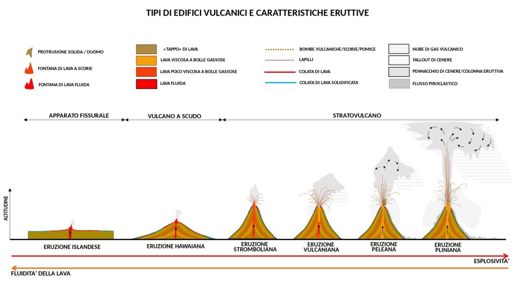 Gli apparati vulcanici possono essere molto diversi gli uni dagli altri e la loro forma dipende dai meccanismi eruttivi e dal tipo di materiale emesso. I differenti tipi di attività e, dell’apparato vulcanico che ne deriva, sono strettamente collegati alla composizione del magma. Abbiamo visto che il magma è una sorta di minestrone di silicati fusi, rocce, cristalli e gas, proprio i gas, combinati con la viscosità del fluido, hanno un ruolo fondamentale nei processi eruttivi.