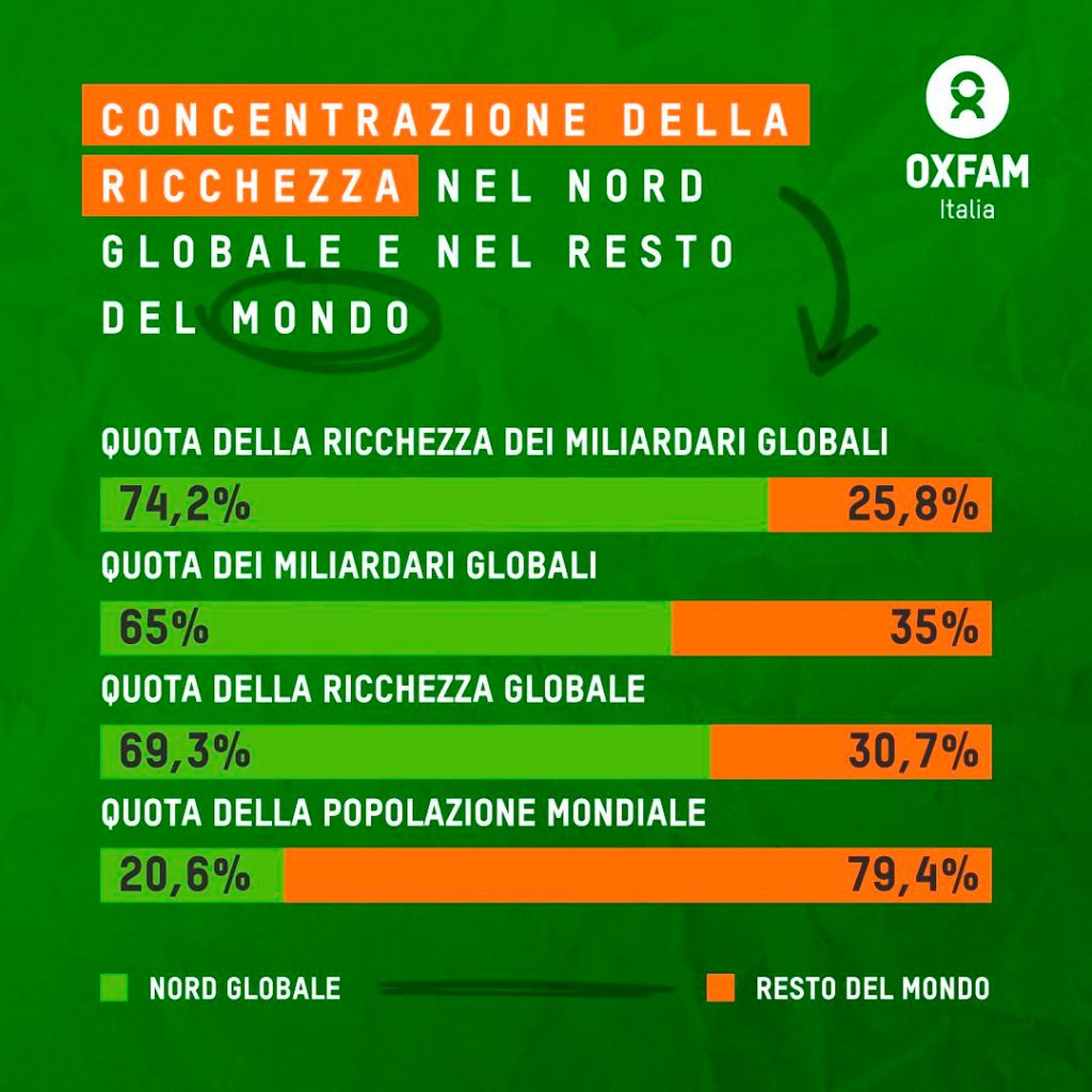 Uno dei box più interessanti del report, nella parte in cui si occupa della distribuzione del reddito a livello globale, riguarda le riflessioni sui numeri: «se la ricchezza dei 5 miliardari più ricchi continuasse a crescere al ritmo degli ultimi cinque anni, ci vorrebbero più di 230 anni per portare sotto l’1% l’incidenza della povertà globale. Se i 5 uomini più ricchi al mondo spendessero 1 milione di dollari al giorno, ci vorrebbero 476 anni per esaurire la loro ricchezza complessiva. A livello globale gli uomini detengono una ricchezza superiore di 105.000 miliardi di dollari rispetto a quella delle donne, differenza equivalente a 4 volte la dimensione dell’economia statunitense. Una donna che lavora nella sanità o nel sociale avrebbe bisogno di 1.200 anni per guadagnare quanto in un anno percepisce, in media, l’Amministratore delegato di una delle 100 imprese più grandi della lista. Tra luglio 2022 e giugno 2023, per ogni 100 dollari di profitto generati da 96 tra le imprese più grandi al mondo, 82 dollari sono fluiti agli azionisti sotto forma di dividendi o buyback azionari. In 52 Paesi i salari non hanno tenuto il passo dell’inflazione. Il monte salari relativo ha visto un calo in termini reali di 1.500 miliardi di dollari nel biennio 2021-2022. Per la prima volta in 25 anni la disuguaglianza a livello globale si è ampliata. E il disastro climatico, di cui i super-ricchi sono tra i principali responsabili, sta drammaticamente esasperando questo divario. La ricchezza è fortemente concentrata nel Nord globale, dove vive soltanto il 21% dell’umanità, ma dove è localizzato il 69% della ricchezza netta privata e il 74% della ricchezza miliardaria globale nelle 350 più grandi imprese». Un altro box di cui si consiglia la lettura riguarda l’impero di Jeff Bezos. Se ne riporta un passaggio: «Jeff Bezos è uno degli uomini più ricchi del pianeta. L’azienda da lui fondata, Amazon, è stata citata in giudizio dalla Federal Trade Commission e da 17 Stati USA con l’accusa di pratiche monopolistiche illecite sugli acquisti online. Il patrimonio di 167,4 miliardi di dollari di Bezos è aumentato di 32,7 miliardi dal 2020. Investendo 5,5 miliardi di dollari, Bezos ha compiuto un viaggio nello spazio e ringraziato i lavoratori di Amazon per aver reso possibile tale avventura. Amazon è nota per reiterati tentativi di scoraggiare la sindacalizzazione dei propri lavoratori».