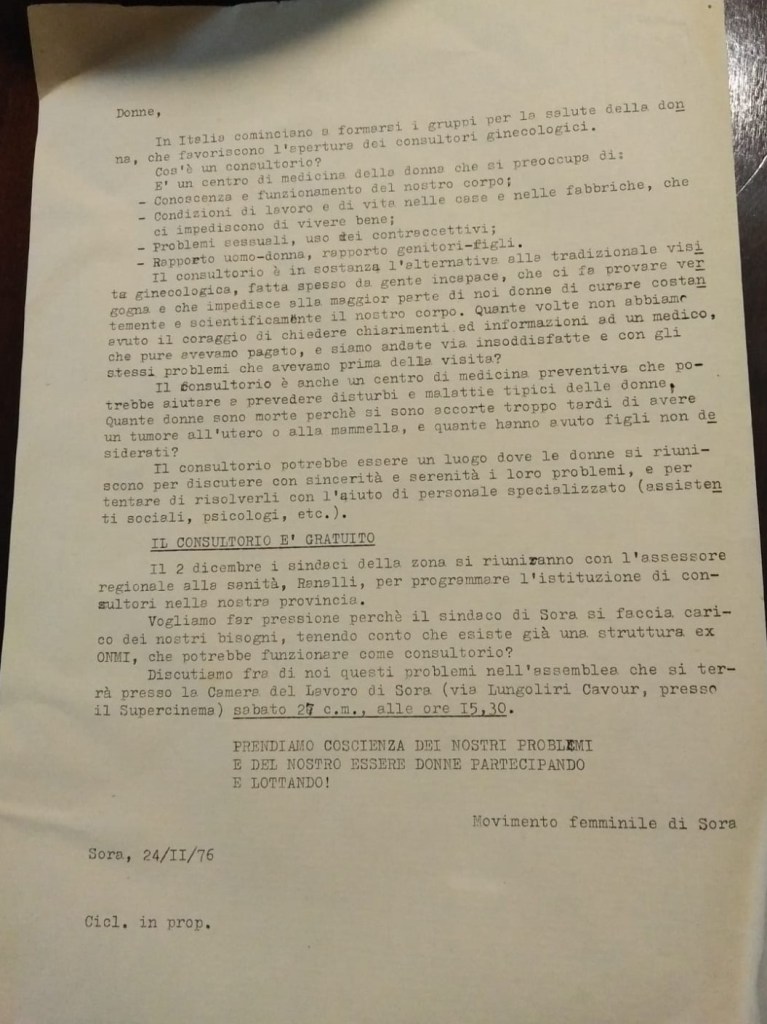 Al di là della triste realtà la legge sull’aborto è stata un traguardo importante per l’Italia. A Sora l’apertura del consultorio è stata irta di difficoltà, come riferisce Marcella P.: «Una delle nostre più grandi battaglie locali ha dato vita al consultorio familiare. È stata una nostra creatura. Quando uscì la legge il Comune di Sora ignorò questa opportunità e noi abbiamo lottato per questa istituzione». «Facemmo una battaglia per l’apertura del consultorio a Sora, – prosegue Anna P.– Era necessario per prevenire l’aborto e dare informazioni sui contraccettivi. Occupammo il consiglio comunale, le donne con i bambini. Il Comune non aveva risposto alla richiesta di aprire il consultorio e i fondi (3 milioni di lire) sarebbero stati ritirati. Riempimmo Sora di manifesti con scritto: “vota NO per non abortire più”. Cercavamo di parlare davanti le chiese».