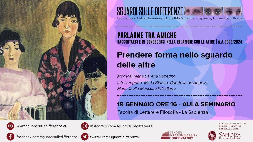 Per il terzo incontro del ciclo Parlarne tra amiche. Raccontarsi e ri-conoscersi nella relazione con le altre, organizzato dal Laboratorio di studi femministi Anna Rita Simeone. Sguardi sulle differenze, si è scelto il tema della sorellanza. Il seminario dal titolo Prendere forma nello sguardo delle altre si è tenuto il 19 gennaio presso la Facoltà di Lettere e Filosofia della Sapienza di Roma e ha avuto, come sempre, un’enorme partecipazione in aula e da remoto. La necessità espressa fin dal principio è stata quella di porre l’accento sulla rilevanza politica dell’attività del parlarsi tra amiche, attraverso tre relatrici appartenenti a tre generazioni diverse, punto fondativo e di forza del collettivo. Gabriella De Angelis, docente di Latino e Greco nei licei e nei corsi dell’Università delle donne “Virginia Woolf”, membro del Laboratorio e del Circolo Lua “Clara Sereni”, per il quale organizza laboratori di scrittura autobiografica; Maria Bianco, insegnante di Filosofia, Storia, Storia della filosofia, Filosofia eco-femminista, Teologa di genere e autrice; Maria Giulia Mancuso Prizzitano, laureata presso il Dams e la New York Film Academy, ha diretto un documentario dal titolo Embodiment; modera la discussione Maria Serena Sapegno, docente di Letteratura italiana e Studi di genere. I testi presi in analisi sono due: un estratto da Tu che mi guardi, tu che mi racconti: filosofia della narrazione di Adriana Cavarero nell’edizione Feltrinelli del 2009, e un articolo di Elena Vacchelli dal titolo L’idea di “sorellanza” nelle epistemologie femministe: l’eredità dell’autocoscienza, contenuto in Sorelle e sorellanza nella letteratura e nelle arti, a cura di Claudia Cao e Marina Guglielmi, edito da Franco Cesati Editore nel 2017 (disponibili qui).