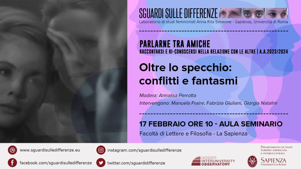 Il quarto incontro tenuto dal laboratorio Sguardi sulle differenze nell’ambito del ciclo Parlarne tra amiche — Raccontarsi e ri — conoscersi nella relazione con le altre, si intitola Oltre lo specchio: conflitti e fantasmi. Si è svolto il 17 febbraio presso la facoltà di Lettere e Filosofia della Sapienza, a Roma. Il tema centrale è l’ambivalenza all’interno dei rapporti tra donne. Dopo aver analizzato, nei seminari precedenti, gli aspetti positivi del rispecchiamento, si dà spazio stavolta a un tema più difficile da affrontare ma altrettanto necessario. Il punto di partenza della riflessione, come si legge nella presentazione, è il seguente: «Conflitto, odio, gelosia e invidia dell’altra hanno raramente trovato luoghi nei quali essere elaborati. Eppure, sono elementi costitutivi delle relazioni fra donne, nelle quali si producono giochi di specchi tra immedesimazione e contrasto, ammirazione e invidia, desiderio e gelosia, senso d’uguaglianza e dissimmetrie. Se da una parte il pensiero patriarcale attribuisce questi sentimenti, fra tutti l’invidia, alle donne (e l’ira, più eroica, agli uomini), dall’altra essi sono generalmente silenziati, rimossi. Tuttavia, le “passioni negative” possono anche trasformarsi in punti di forza perché spingono a riconoscersi debitrici e bisognose l’una dell’altra, riducendo le pretese di onnipotenza. Esploriamo i sentimenti scomodi, scoprendone le sfaccettature e il potenziale politico». Come d’abitudine, ad avviare la discussione sono i testi proposti: Silvia Vegetti Finzi, La mela avvelenata: funzione dell’invidia nella relazione tra donne, nel volume L’invidia. Aspetti sociali e culturali, Scheiwiller 1990, a cura di Gustavo Pietropolli Charmet e Massimo Cecconi; Luisa Muraro, Le ragioni che una donna può avere di odiare la sua simile in Piccoli racconti di misoginia di Patricia Highsmith, La Tartaruga nera 1984; Patricia Highsmith, Piccoli racconti di misoginia.