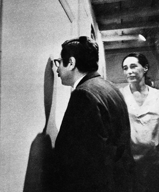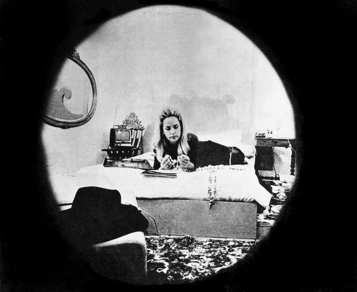 Un’altra artista che ribalta i rapporti della visione è Giosetta Fioroni: nel maggio del 1968 la sua Spia ottica inaugura il celebre Teatro delle mostre, una rassegna organizzata a Roma dalla galleria La Tartaruga di Plinio de Martiis il quale ogni sera per un mese permise ad artisti e artiste di sfruttare lo spazio espositivo a proprio piacimento. Giosetta Fioroni delimita una porzione della galleria e vi allestisce dentro una riproduzione fedele della sua camera da letto; chiusa all’interno della stanza l’attrice Giuliana Calandra fuma sigarette, sfoglia riviste sdraiata sul letto, si spoglia, si trucca, ripetendo queste azioni per tutta la sera. Il pubblico è relegato fuori, ma può sbirciare dall’altra parte attraverso uno spioncino.
