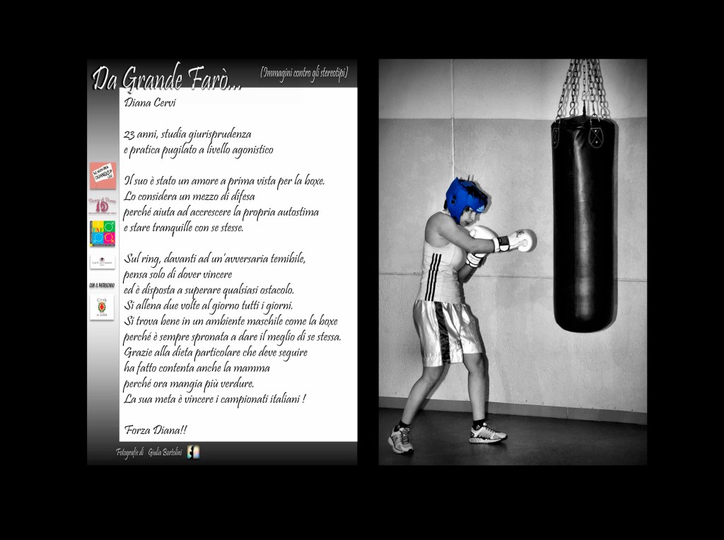 Diana Cervi, era studente in giurisprudenza e praticava pugilato a livello agonistico, in seguito ha vinto il titolo italiano universitario nel 2016 a Reggio Emilia, ha partecipato alle gare nazionali universitarie comprese le due edizioni del Guanto d’oro, ha lasciato il pugilato nel 2018, si è sposata e ora lavora al Politecnico di Milano.