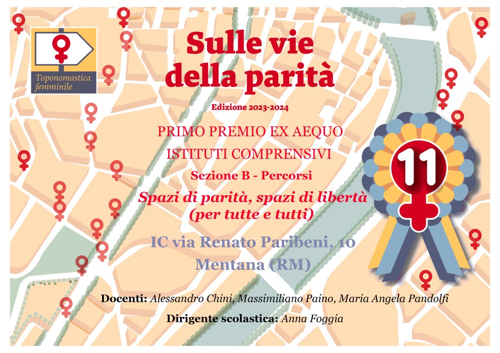 Alle premiazioni del concorso Sulle vie della parità tenutosi presso la facoltà di Scienze della Formazione dell’Università degli Studi di Roma Tre è stato premiato l’Istituto Comprensivo Paribeni di Mentana per il suo progetto Spazi di parità, spazi di libertà, per tutti e tutte.