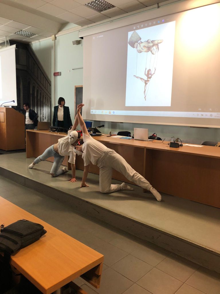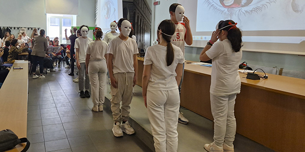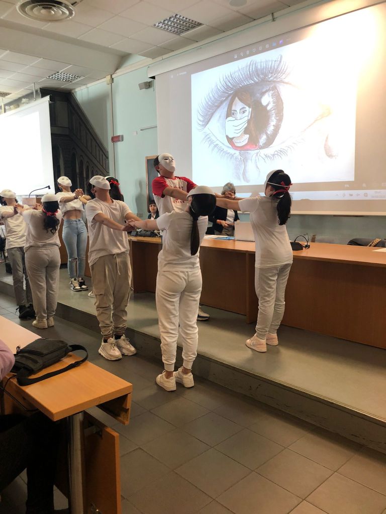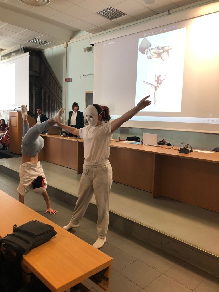Le alunne e gli alunni del Da Vinci – centosedici di cui cinquantasette maschi e cinquantanove femmine – hanno lavorato sotto la guida dei diversi dipartimenti coinvolti: Lettere, Sostegno e Strumento Musicale. Il primo ha visto la partecipazione delle docenti Silvia Conte, Maria Grazia Coseglia e Carlotta Selvi e ha riguardato le classi II G III F, III E. Con la guida della docente Selvi, le classi III F e II G hanno realizzato quattro coreografie sulla musica della compositrice Elisabetta Oddone. Il progetto – come si legge nella scheda-docente – «ha previsto un percorso di scoperta e conoscenza dell’altro attraverso l’utilizzo della danza, come strumento di incontro, privo di barriere etniche e d’età, con l’obiettivo di esprimere, attraverso il movimento del corpo, i valori comuni della condivisione, dell’accettazione, della socialità e di far scoprire ai ragazzi l’universalità di questa forma d’arte». Le alunne e gli alunni hanno rappresentato la capacità di non sentirsi giudicati – tramite anche l’utilizzo di maschere – innescando uno spirito di crescita e riflessione riguardante una società in cui è sempre più necessario parlare di tematiche quali body-shaming, vergogna e contrasto tra realtà e apparenze per arrivare a sentirsi tutte e tutti uguali, promulgando un messaggio di lotta contro la violenza e la fragilità.