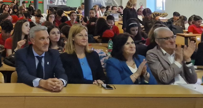 L’alta partecipazione alla cerimonia di premiazione (una delegazione di più di cento persone fra studenti, docenti, dirigente e genitori) è stata il coronamento di questa iniziativa, enfatizzando come gli allievi e le allieve siano state completamente investite nella realizzazione di questo ambizioso progetto che dalle mura di un’aula si è esteso fino alle stanze del Comune di Ciampino. Infatti alla delegazione hanno preso parte anche l’onorevole Antonio Rugghia, presidente dell’associazione “Casa delle Culture” e la sindaca del comune di Ciampino, avvocata Emanuela Colella, che pure ha accolto con piacere l’invito. Inoltre hanno partecipato l’assessore alla pubblica istruzione Roberto Mantua e la dirigente scolastica Eliana Restucci, che hanno molto apprezzato le perfomances delle classi.