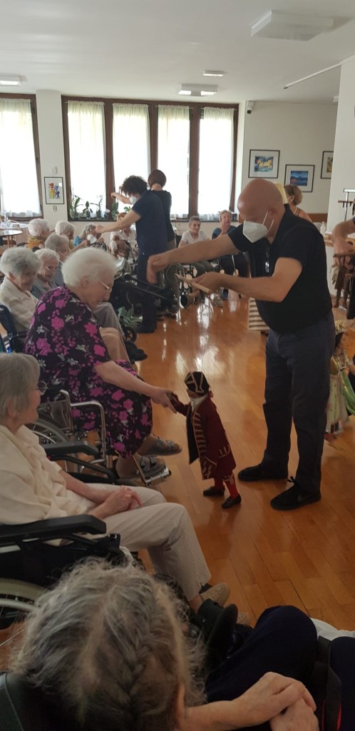 Le voci tremule delle nostre meravigliose nonagenarie/centenarie si uniscono al canto e le braccia disegnano piccole volute di note nell’aria.
