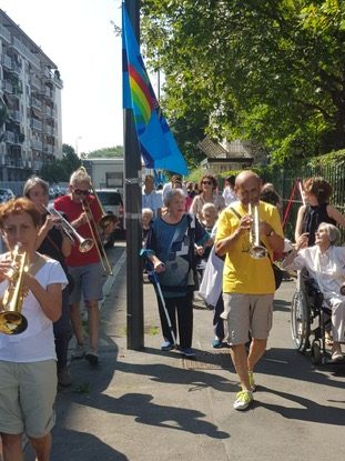 Ok, ladies. Contatto la Banda degli Ottoni a scoppio, famosissima a Milano perché dà voce ai senza voce e suona a tutti gli eventi importanti della città. È una banda dalla formazione variegata e di primo acchito non si può sapere quanti saranno gli elementi partecipanti alla mattinata del 10 luglio, giornata lavorativa per molti di loro. Ci fidiamo. Basta che vengano. Già ci fanno un piacere! Infatti musiciste/i subito accettano di scortare la sfilata delle signore in carrozzina che assisteranno alla cerimonia.