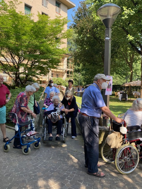 Arriva il momento fatidico: banda e carrozzine guidate dallo staff infermieristico si schierano vicino al luogo della celebrazione, nel bel parco alberato. “Ta-da 🎶”. Scende il drappo, si scopre la targa: questo è ora il Giardino Antonietta Biffi, benefattrice.