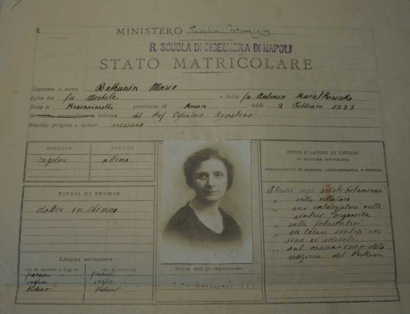 Maria Bakunin fu anche nella Società dei Naturalisti di Napoli, fino dal 1922, e nell’Istituto d’incoraggiamento, una antica istituzione scientifica sorta nel Regno di Napoli all’epoca della dominazione napoleonica.