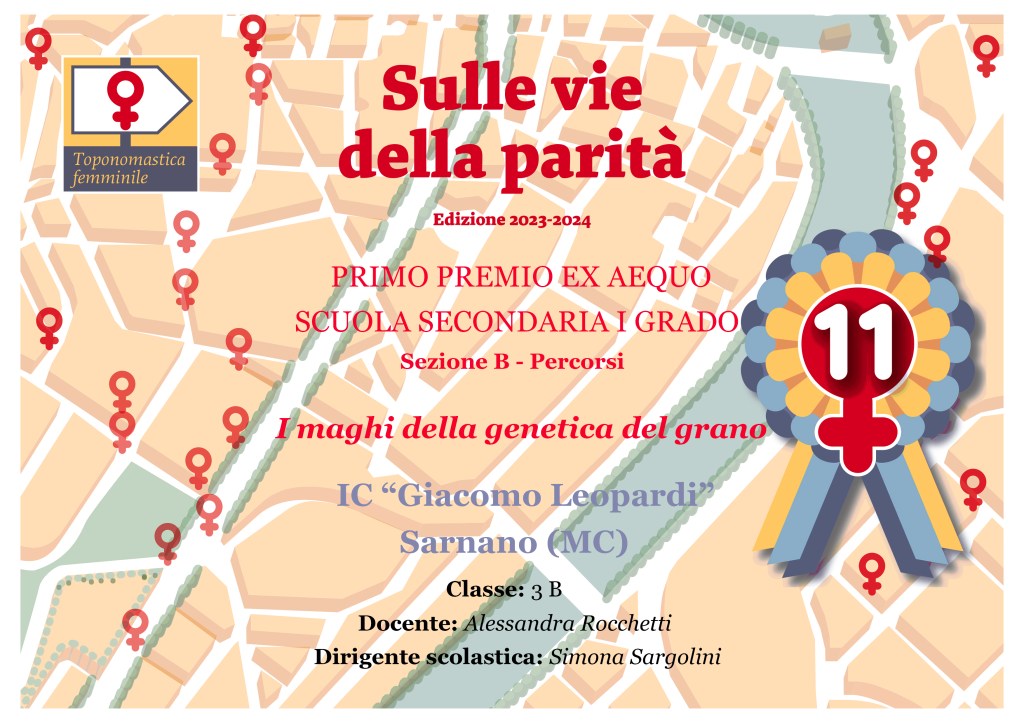 Il progetto è stato poi premiato anche all’ XI concorso nazionale Sulle vie della parità di Toponomastica femminile, il 19 aprile a Roma, nella cerimonia che si è tenuta presso l’Università Roma 3. La commissione — si legge nella motivazione con cui i ragazzi e le ragazze hanno ricevuto il premio il 12 aprile 2024 all’Università di Camerino — intende premiare la classe 3 B della Scuola secondaria di primo grado “Giacomo Leopardi” di Sarnano per l’aver portato alla luce il lavoro di donne che hanno contribuito fattivamente al progresso scientifico; in particolare, di Carlotta Parisani, moglie di Nazareno Strampelli, coniugi impegnati nel miglioramento genetico delle varietà di grano. La commissione ha molto apprezzato il lavoro svolto da ragazze e ragazzi in piena autonomia, utilizzando tecnologie e linguaggi comunicativi originali e personali, in un rapporto peer to peer fra studenti che hanno organizzato una redazione per la creazione di podcast e suddiviso il lavoro in gruppi impegnati nei vari aspetti del progetto, dalla scrittura all’editing, dalla gestione del materiale multimediale alla comunicazione sui social. Il tutto nella consapevolezza di quanto ricerca e progresso scientifico vengano svolti sul proprio territorio e del basilare ruolo, spesso marginalizzato, rivestito dalle donne nel progresso scientifico.