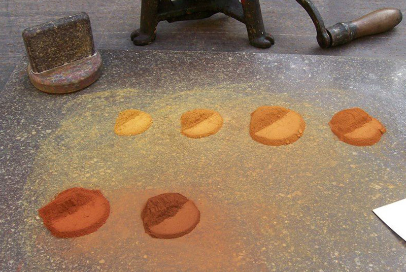 Ocra, dal greco ὠχρός, che significa pallido, sbiancato, gialliccio, è il nome che diamo adesso a quelle terre, la sostanza chimica responsabile del colore è la stessa della comune ruggine: l’ossido ferrico monoidrato Fe2O3 H2O. In natura si trova in alcune argille che contengono dei minerali ricchi in ferro come la limonite e l’ematite. Il pigmento, che è sostanzialmente un’argilla gialla, si ricava con la macinazione e il lavaggio delle argille. L’ocra rossa si produce riscaldando l’ocra gialla, eliminando l’acqua per produrre ossido ferrico anidro. Controllandone la “cottura” è possibile produrre una gamma di sfumature dal giallo caldo al rosso vivo. L’ocra rossa si trova naturalmente nelle regioni vulcaniche dove l’attività termica ha causato la disidratazione. Le “terre” sono ancora oggi molto utilizzate dai pittori perché economiche e durevoli.