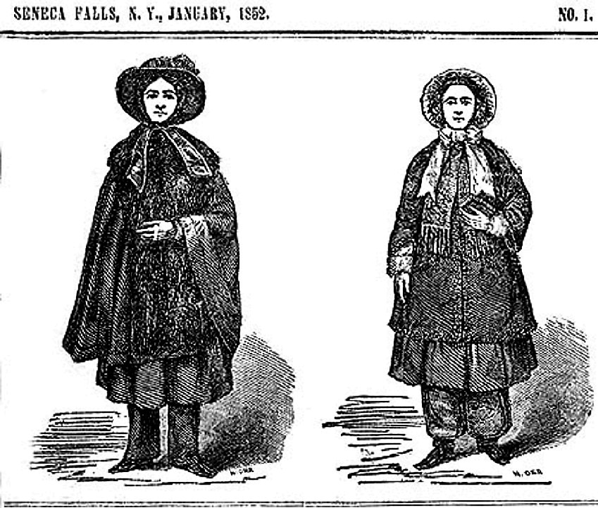 Negli Stati Uniti e oltreoceano l’abito ebbe più scalpore e risonanza di altre notizie sul Movimento dei diritti delle donne che nel luglio del 1848, alla Convenzione di Seneca Falls, produsse il suo primo documento pubblico. Amelia partecipò alla convenzione e ne fu profondamente segnata, impegnatissima sul versante della Temperanza, non impiegò troppo tempo per rendersi conto che le cause non solo non confliggevano, ma erano entrambe riconducibili alla condizione di disuguaglianza fra uomo e donna nella vita pubblica e privata. Al tempo della convenzione viveva a Seneca Falls con il marito Dexter, avvocato, editore, politico progressista, proprietario del Seneca County Courier. Amelia pubblicava i suoi articoli sul Temperance Star di Rochester e sul Courier.