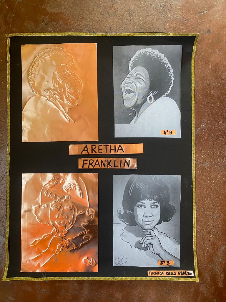Per lo studio della biografia della cantautrice e pianista afroamericana Aretha Franklin, i/le ragazze hanno usufruito del supporto del libro di Gabriele Antonucci Aretha, la regina del soul e dei numerosi materiali biografici disponibili. A conclusione della loro analisi, le classi hanno realizzato, con la tecnica dello sbalzo, un quadro su foglio di rame raffigurante l’artista.