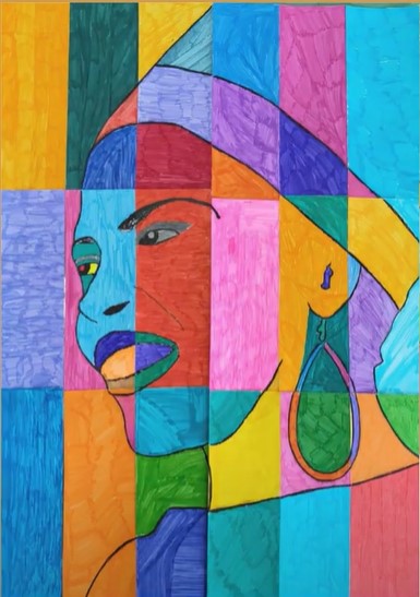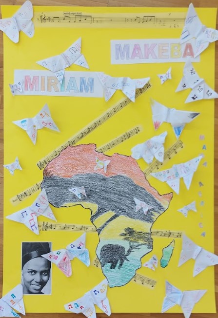 Seguendo lo spirito della canzone più famosa della cantante, Pata pata, inno alla gioia e al desiderio di ballare, gli/le alunne si sono poi cimentate nella danza, ballando una coreografia da loro ideata. Particolarmente significativo è il ritratto che i/le bambine hanno realizzato, un mosaico composto da diverse parti, ciascuna delle quali colorata secondo il gusto del singolo. Il disegno che ne risulta è emblema del valore della diversità e del prezioso contributo che ognuno/a di noi può addurre alla comunità.