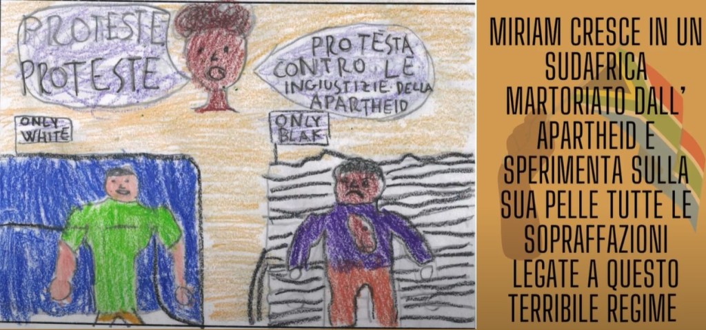 Gracias a la vida è il brano folk della compositrice e interprete cilena Parra oggetto del lavoro prodotto dagli/dalle alunne. Cospicuo è anche il progetto a cui hanno lavorato le classi della scuola primaria “Santa Alexinidda”. Tra le figure femminili che gli/le studenti hanno individuato come soggetto della propria ricerca figurano la musicista Nina Simone, pseudonimo di Eunice Kathleen Waymon, e Miriam Makeba. A quest’ultima, integrando quanto fatto dai/dalle compagne dell’istituto per l’infanzia “Alberto Riva”, è stato dedicato un video in cui, attraverso i disegni dei/della bambine, si ripercorre la vita dell’artista, dalla nascita, avvenuta in una capanna di un ghetto vicino Johannesburg, alla sua scomparsa, passando per il trasferimento negli Stati Uniti negli anni Sessanta e il suo ritorno nella terra natia dove le verrà attribuito lo pseudonimo di Mama Africa e dove, grazie al suo impegno per la difesa dei diritti civili, diventerà rappresentante delle Nazioni Unite.