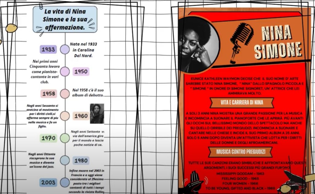 L’apporto degli/delle studenti della scuola secondaria di I grado “Via Piceno” è stato particolarmente prezioso e ha concorso ad arricchire la disamina condotta dai/dalle colleghe in merito alla figura di Idelgarda di Bingen e di Nina Simone. In particolare, per quest’ultima, è stato realizzato un video riassuntivo della sua vita e della sua carriera, costellata di grandi successi come Feeling Goode Mississippi Goddam.