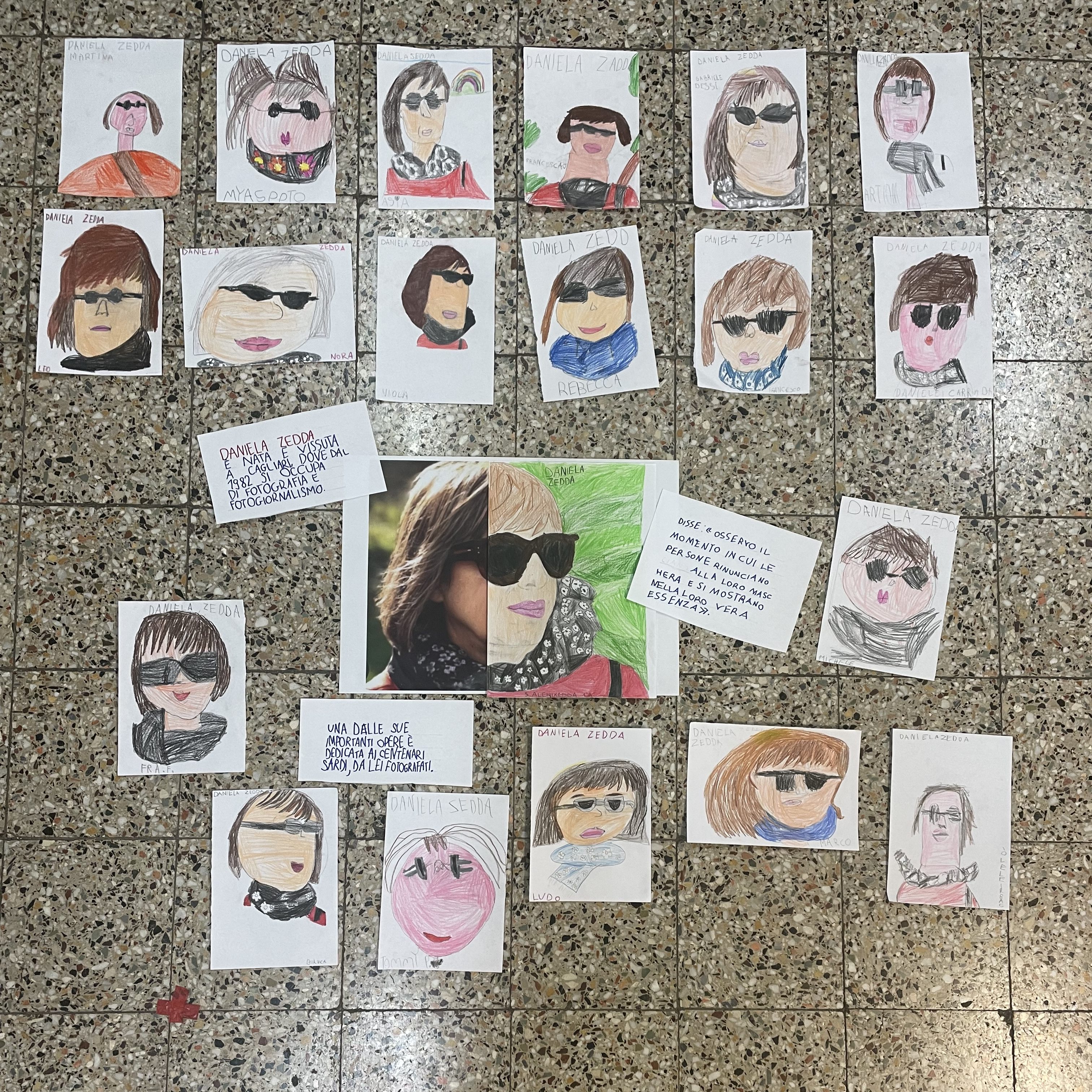 Unisce e accomuna il lavoro svolto dai diversi istituti la figura di Daniela Zedda, trait d’union dell’intero progetto. Fotografa professionista, Zedda si occupa di fotografia e fotogiornalismo fin dal 1982, «cimentandosi — come si legge nella scheda/docenti — soprattutto in ambiti fortemente culturali e del mondo dello spettacolo: famosi i suoi ritratti di centenari sardi, le numerose mostre personali e collettive realizzate in tanti paesi della Sardegna, in numerose regioni italiane», europee e d’oltreoceano. Le sue fotografie sono apparse «nei maggiori quotidiani e periodici, locali e nazionali», come L’Espresso, Il Manifesto, Il Corriere della Sera, La Repubblica, L’Europeo, Vogue Casa, Il Sole 24 ore, Panorama, Le Monde e altri. In onore dell’artista cagliaritana le classi del plesso di Santa Caterina hanno realizzato una presentazione digitale a conclusione di un iter laboratoriale in cui i/le bambine «partendo dalle foto dei visi dei loro nonne e nonni, hanno ricalcato le rughe e i tratti dei volti» per rappresentare paesaggi, oggetti e animali. La tecnica utilizzata è dichiaratamente ispirata al progetto del Festival di letteratura Tuttestorie. Rughe rigagnoli, fosse e fossette, in occasione del quale gli/le studenti avevano avuto l’onore di essere fotografati dall’artista. A lei sono stati dedicati molteplici ritratti, rielaborazioni grafiche degli spazi del Parco della Musica da lei ispirate, fotografie in cui vengono catturati in compagnia di un oggetto che rappresenti le loro passioni. Corposo è anche il materiale ritrattisti coprodotto. Materie umanistiche, arti visive e capacità tecniche si fondono perfettamente nel foto mosaico composto dalle cianotipie delle opere di Daniela Zedda, realizzato dalle classi seconde di Via Piceno. Si tratta di un procedimento di stampa che permette di ottenere un’immagine fotografica positiva, utilizzando due sali di ferro (potassio ferri cianuro e ferrico ammonio citrato). Mescolati insieme, i due elementi diventano sensibili alla parte ultravioletta della luce solare; così, una volta posizionato un negativo sopra la superficie precedentemente sensibilizza ed esposta alla luce solare, è possibile conseguire il risultato finale.