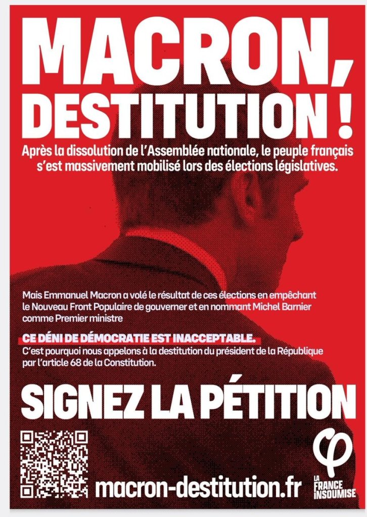 Di fronte al comportamento di questo presidente arrogante e autoritario, La France Insoumise ha sfoderato l’arma estrema, l’ultima via istituzionale possibile che la Costituzione prevede nel caso in cui il capo dello Stato non rispetti le scelte democratiche: la destituzione. È una procedura complicata che difficilmente andrà a buon fine (richiede l’accordo dei due terzi del Parlamento), ma è già un segnale forte. Se in un primo momento tale proposta ha spiazzato la sinistra e contrariato il Partito Socialista, ha invece raccolto in seguito l’unanimità del Front Populaire, maggioritario all’Assemblée Nationale, e, per il momento, il silenzio dell’RN. La difficoltà principale, si trova nel fatto che tale procedura, per arrivare a compimento, dovrà essere approvata da un’improbabile alleanza fra i due fronti, quello popolare e quello nazionale, spaccando il terzo fronte, quello repubblicano.