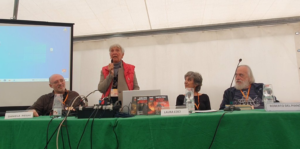 Ha commosso non soltanto noi l’affettuoso saluto (quasi un viatico) rivolto alle Fantascientiste (femministe)n da Daniela Piegai, giunta in giornata dalla sua Cortona, lei che già nel 1991 scriveva: «La fantascienza mi è sempre piaciuta: è una letteratura totalmente libera, aperta a tutte le possibilità». Daniela sarebbe stata poi protagonista del panel successivo, a lei dedicato, di presentazione del romanzo visionario Le fortezze dell’alba, quinta uscita di questa grande della fantascienza italiana, e non solo, per l’editore Delos Digital. E Piegai è anche vincitrice della prima edizione del Premio Porco Rosso, i cui racconti finalisti sono confluiti nel volume Meglio porco che fascista! (omaggio al grande Hayao Miyazaki), prima uscita della collana ‘Fantascienza Resistente’ (per una fantascienza antifascista, comunitaria, femminista). Per inciso: degli otto testi finalisti quattro sono scritti da uomini (Giuliano Cannoletta, Roberto ‘Robiz’ Pastene, Mario Pesce, Mariano Rampini) e quattro da donne (Elisa Franco, Daniela Piegai, Silvia Tebaldi, Vanessa West).