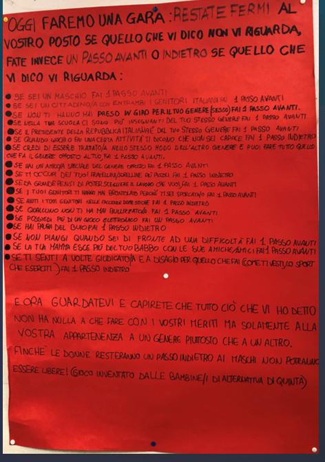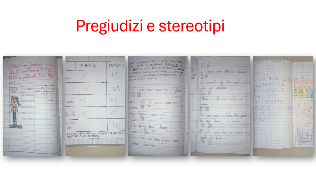 Partendo da indagini in ambito personale, familiare, territoriale per l’individuazione di quei comportamenti/stereotipi/discriminazioni di genere che limitano la libertà di realizzazione ed espressione personale, anche tramite interviste, questionari, tabelle, sono emerse riflessioni condivise sulla necessità di valorizzare e rispettare le diversità e stimolare la costruzione di rapporti paritetici tra coetanee/i, supportate da giochi e attività utili per sviluppare relazioni affettive positive tra i generi.