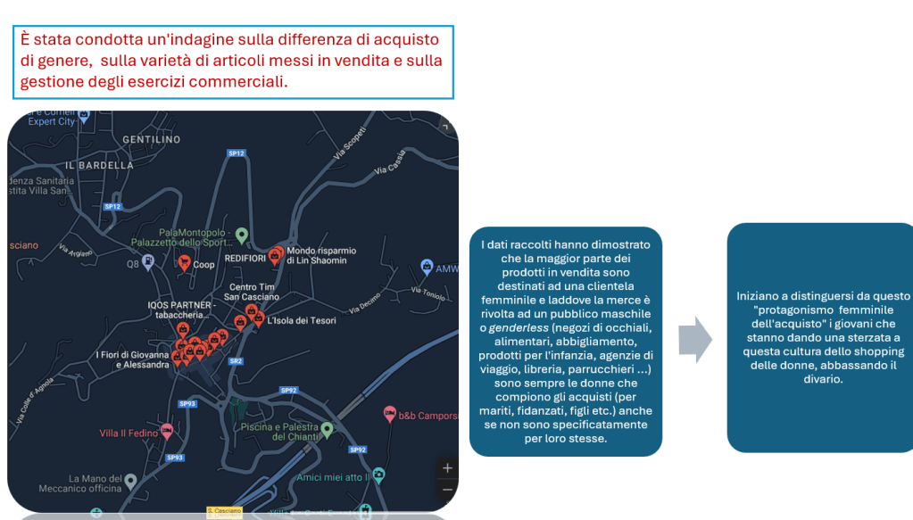 L’uscita didattica a piccoli gruppi nel centro storico del paese ha assunto uno sviluppo innovativo centrato sul “censimento” quantitativo e qualitativo delle attività commerciali tramite un’indagine sulla differenza di acquisto di genere, sulla varietà di articoli messi in vendita e sulla gestione degli esercizi commerciali. In questo caso è stato possibile interpretare i dati raccolti da cui è emerso che la maggior parte dei prodotti in vendita sono destinati ad una clientela femminile e laddove la merce è rivolta ad un pubblico maschile o genderless sono sempre le donne che compiono gli acquisti (per mariti, fidanzati, figli etc.) Iniziano a distinguersi da questo “protagonismo femminile dell’acquisto” i giovani che stanno dando una sterzata a questa cultura dello shopping delle donne, abbassando il divario.