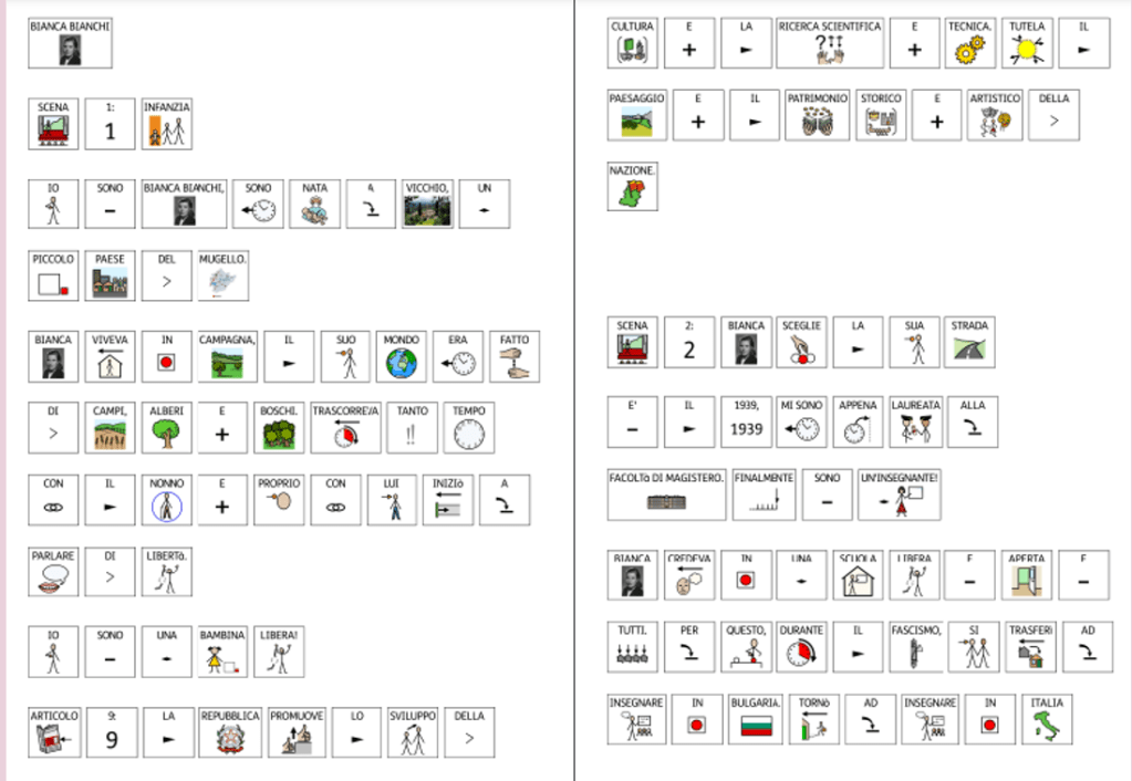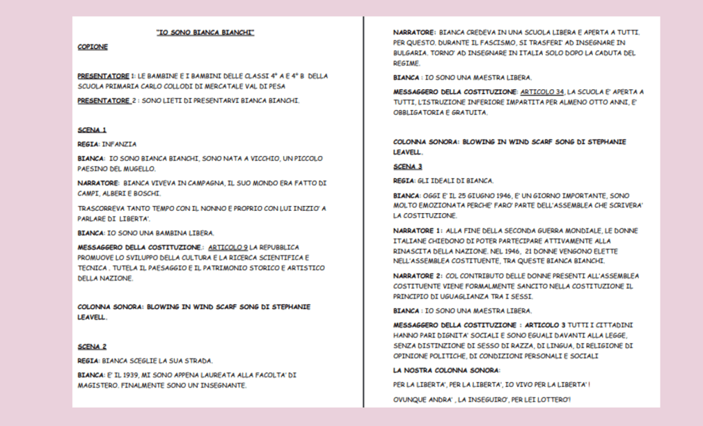 Il percorso interdisciplinare che comprende italiano, storia, ed. civica, canto, musica, teatro, si snoda in tre momenti indicativi che, partendo dall’autobiografia, passa al racconto di donne significative per i bambini e le bambine, per poi attraversare e conoscere altre storie di donne che hanno fatto la Storia e si conclude con la scrittura biografica collettiva di Bianca Bianchi, quale sceneggiatura dello spettacolo reso al pubblico, A scuola di libertà.