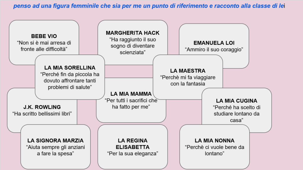 L’individuazione di alcune donne incontrate nel gioco sulle quali avviare un percorso di approfondimento, attraverso quelle che sono state le loro stesse attività e quindi: “costruire” come Zaada Hadid, “ballare e cantare” come Miriam Makeba, “piantare semi” come Wangari Maathai…, ha sviluppato empaticamente nei ragazzi e nelle ragazze, l’immedesimazione e l’identificazione; tale pratica ha avuto come effetto che le donne “conosciute” sono diventate, un modello di riferimento, contribuendo peraltro a sviluppare e ampliare l’ambito delle competenze degli stessi/stesse discenti.