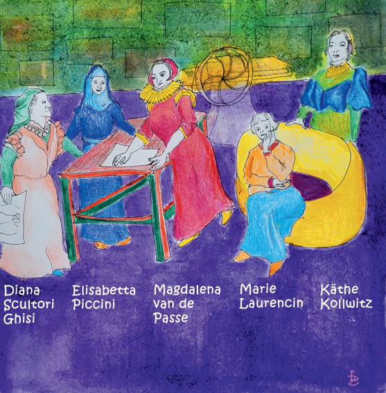 Tra le incisore di febbraio troviamo Diana Scultori Ghisi che si formò nella Mantova dei Gonzaga e poi a Roma raggiunse la maturità artistica, la tedesca Magdalena van de Passe, a cui fu permesso di firmare i suoi lavori, Marie Laurencin, protagonista indiscussa della scena artistica dell’Europa degli inizi del Novecento, Elisabetta Piccini che diventata suor Isabella continuò a stampare, e infine Käthe Schmidt Kollowitz che ha raccontato con un segno sintetico e l’alternanza di bianco e di nero la miseria di operai e contadini, il dolore della guerra.