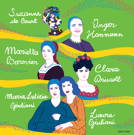 Marietta Barovier, il cui nome è legato alla storia delle perle veneziane, Suzanne de Court, identificata anche grazie alla firma apposta su alcune sue creazioni, l’americana Clara Driscoll, che ha lavorato a lungo da Tiffany, le sorelle Maria Letizia e Laura Giuliani, che alla morte del padre diressero il laboratorio di vetreria della famiglia a Roma, la danese Inger Hanmann, che utilizzò lo smalto industriale per i suoi lavori.