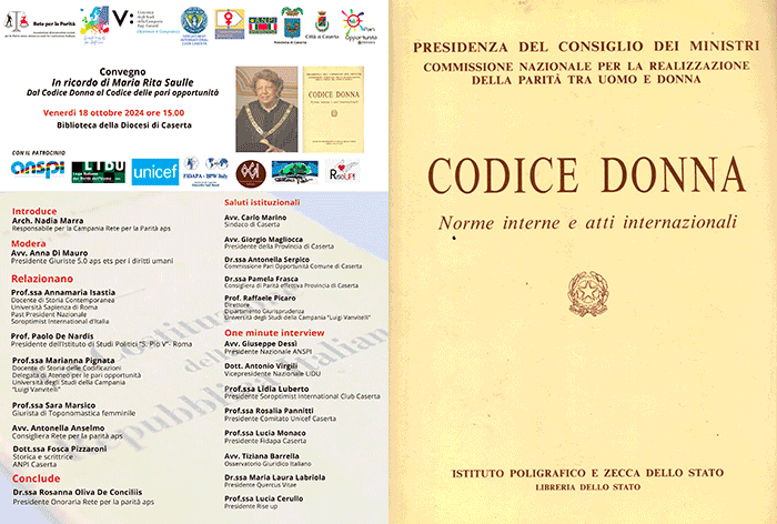 Dopo i saluti istituzionali della Presidente del Tribunale di Santa Maria Capua Vetere, Gabriella Maria Casella, della dottoressa Antonella Serpico Presidente della Commissione Pari opportunità di Caserta, dell’assessora al Patrimonio Anna Papa, Professoressa ordinaria di Diritto pubblico, Diritto dell’informazione, della Comunicazione e dell’informatica presso l’Università Parthenope di Napoli, l’architetta Nadia Marra, referente regionale per la Campania della Rete per la parità, ha introdotto il Convegno, moderato mirabilmente e con grande competenza dall’avvocata Anna Di Mauro. Il discorso di Marra, di grande qualità, che ho avuto modo di leggere attentamente, è stato articolato e approfondito, sia nella descrizione delle molteplici attività di Maria Rita Saulle che sul percorso dei diritti delle donne e della legislazione sulla parità. Marra si è soffermata sul Codice Donna, quel lavoro corale di giuriste colte e preparate che rappresentò negli anni Ottanta un poderoso lavoro di ricognizione di tutta la normativa sui diritti delle donne, da quella nazionale, partendo dalla Costituzione, a quella internazionale, comprensiva di atti, Dichiarazioni, Convenzioni e raccomandazioni. Ricordiamo i nomi di queste donne che seppero progettare e lavorare insieme: Agata Alma Cappiello, Marisa Del Bufalo, Elena Marinucci, Laura Remiddi, Maria Rita Saulle. Di Agata Alma Cappiello Marra ha ricordato il paziente lavoro per inserire nel dibattito pubblico il tema delle cosiddette “azioni positive” e il suo impegno di parlamentare per farne approvare la legge relativa e un organismo di pressione e di sorveglianza presso il Ministero del lavoro, il Comitato nazionale per l’attuazione dei principi di parità di trattamento e uguaglianza di opportunità tra lavoratori e lavoratrici. Marra ha anche approfondito il concetto di “doppia militanza” delle femministe degli anni Ottanta, ribadito recentemente anche dalla storica del pensiero politico femminile Fiorenza Taricone. In conclusione del Convegno Marra ha sottolineato l’importanza della progettualità collettiva delle donne, grazie alla quale questo Convegno ha potuto essere realizzato e che ha visto il coinvolgimento di molte associazioni, in primis Rete per la parità e Giuriste 5.0 per i diritti umani, unite dalla volontà di riconoscere la figura di una donna tanto valente e ingiustamente dimenticata.