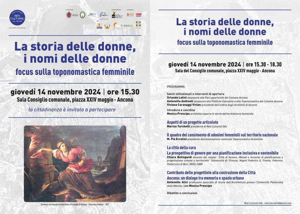 L’associazione Reti culturali, in collaborazione con Toponomastica femminile, nel corso del 2024 ha realizzato, oltre a webinar mensili per il ciclo Cambiamo discorso (si possono leggere qui) anche incontri con due istituti superiori di Ancona — il liceo artistico Edgardo Mannucci e l’Iis Vanvitelli-Angelini-Stracca di Ancona — e ha in programma gli allestimenti di due mostre tematiche — su Donne e arti minori e Le Nobel per la Scienza — con un incontro pubblico cittadino, che si terrà presso la Sala del Consiglio comunale di Ancona il giorno 14 novembre 2024 prossimo. A conclusione ci sarà anche una pubblicazione, una Antologia che raccoglierà i testi delle relazioni e il report delle azioni svolte, per fissarne la memoria così che i risultati non vadano dispersi.