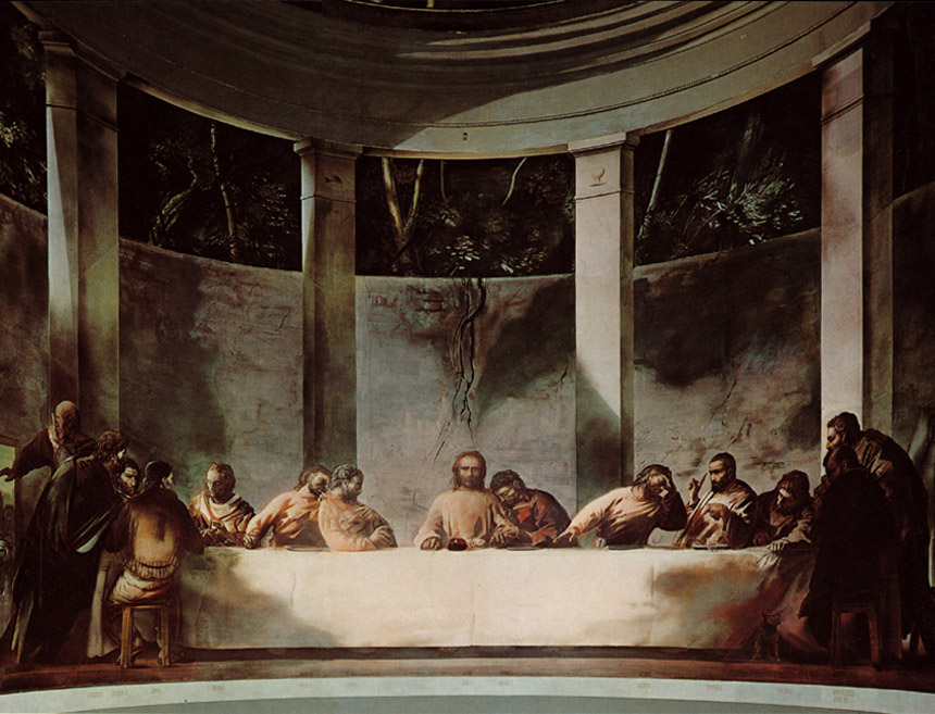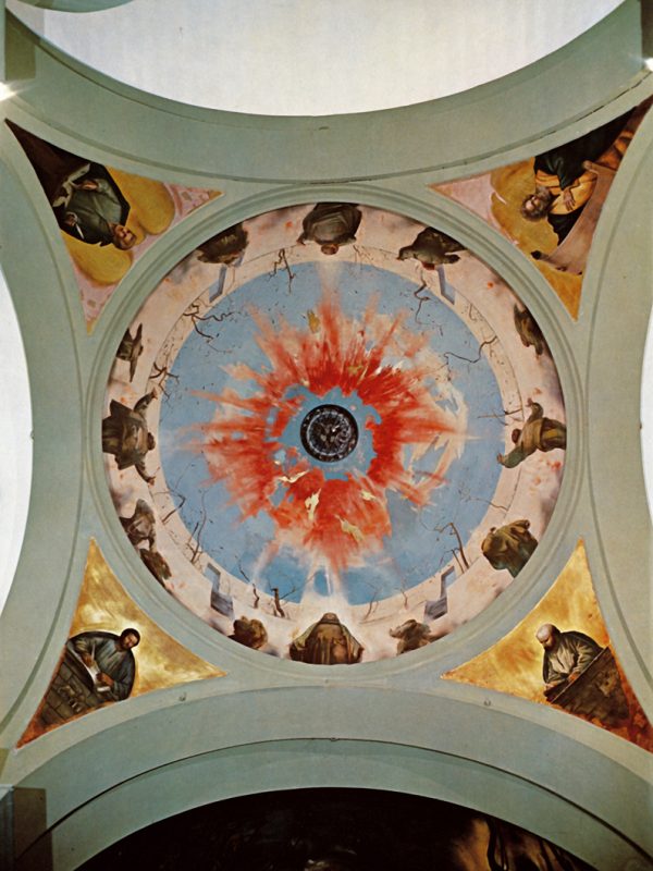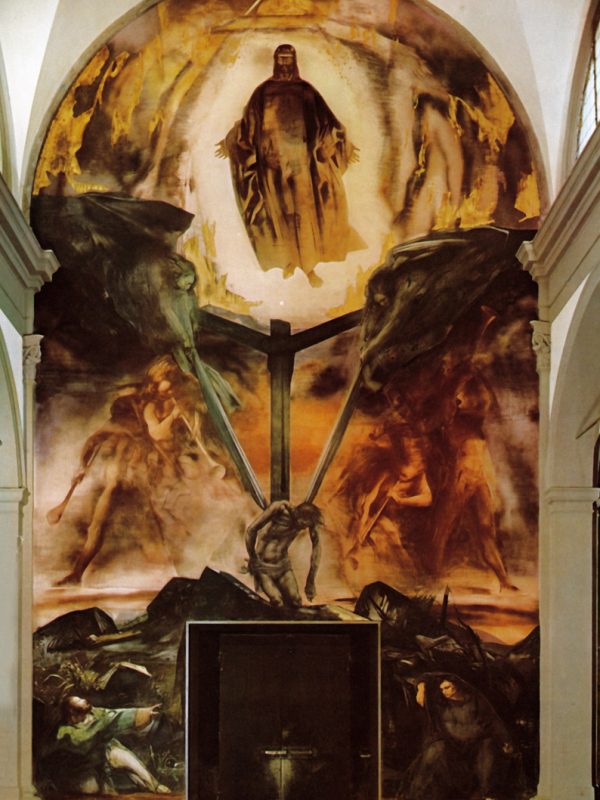 Si è trattato di lavoro faticoso e impegnativo, dal momento che sono ben 160 mq. di superficie, che andò avanti per lungo tempo, dal 1967 al 1988, l’anno della morte, con l’intento di concludere finché le forze lo sostenevano; è risaputo, infatti, che la tecnica dell’affresco su superfici grandiose comporta ponteggi, su cui salire e scendere agevolmente, e posizioni del corpo stancanti a qualsiasi età, figuriamoci per un ultra settantenne. Entrando nella chiesa si apprezzano, nella controfacciata, l’imponente Deposizione e Resurrezione con ai lati i maestosi profeti Isaia e Geremia, la Pentecoste (nella cupola), l’Ultima cena, sovrastata dall’Apocalisse (nell’abside), la Guarigione del paralitico nella piscina di Betzaeta (parete di sinistra), la Resurrezione di Lazzaro e Gesù nell’orto del Getsemani (parete di destra), insieme ad altre scene realizzate da allievi. Il colpo d’occhio è magnifico e i singoli elementi emergono dall’ombra in maniera drammatica, con infinite sfumature di colore e visioni ora cupe ora serene.