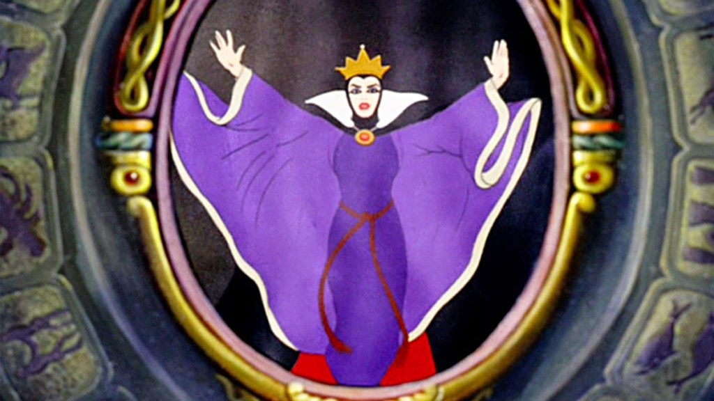 La scena che apre il lungometraggio Disney mostra la Regina che invoca il Mago dello Specchio affinché le confermi la sua insuperata bellezza; questi, però, la delude, rivelando che ora è Biancaneve la più bella. Che sia garante di una verità oggettiva, o che sia il ventriloquo dei timori della Regina, lo Specchio è metafora espressiva del disturbo narcisistico, perciò il suo responso, nella prospettiva della matrigna, è incontestabile. Chi pone il giudizio estetico come valore primario, rivela una percezione alterata. Si noti che Biancaneve minaccia il primato estetico della matrigna solo quando si scopre capace di destare l’interesse maschile: l’epifania dell’adolescenza si manifesta nell’incontro col Principe. La codificazione scenica raffigura Biancaneve non più circondata dal candore dei fiori bianchi — indizio dell’innocenza infantile —, ma immersa in variopinte infiorescenze.