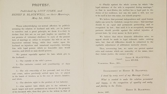 Lucy Stone e Henry Blackwell si sposarono nel 1855 apparentemente nel rispetto della tradizione con gli abiti di nozze appropriati, il pranzo offerto da Francis Stone e le lacrime della sposa, ma la cerimonia venne officiata dal ministro unitario attivista Thomas W. Higginson e la sposa non solo non fece alcuna dichiarazione di obbedienza al coniuge, ma nemmeno assunse il cognome del marito. Lucy e Henry lessero e consegnarono al ministro una Protesta di Matrimonio in cui, contestando le leggi matrimoniali che «conferivano al marito una superiorità ingiuriosa e innaturale», rivendicavano la completa libertà della moglie come «essere indipendente e razionale» e i suoi diritti alla custodia della prole, all’eredità, a fare testamento, a gestire i propri guadagni, a condividere le scelte di vita in comune in una partnership paritaria permanente.