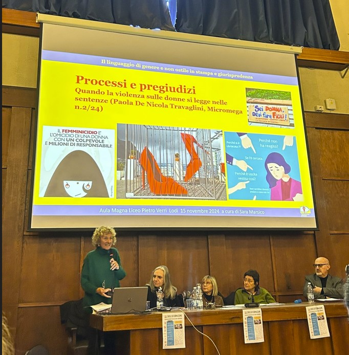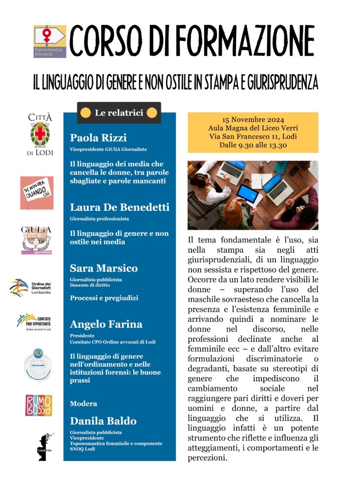 Il corso di formazione Il linguaggio di genere e non ostile in stampa e giurisprudenza si è tenuto Venerdì 15 novembre a Lodi, presso l’Aula Magna del Liceo Verri. Patrocinato dal Comune di Lodi e organizzato dall’associazione Toponomastica femminile, in collaborazione con altre realtà lodigiane fra cui in primis il movimento Snoq Lodi Se non ora, quando?, era rivolto a giornaliste/i e avvocate/i locali, con l’obiettivo di presentare l’importanza dell’utilizzo di un linguaggio non sessista e rispettoso del genere, con interventi di esperte ed esperti. Alle professioniste e professionisti iscritti agli Ordini professionali, sono stati riconosciuti crediti deontologici.