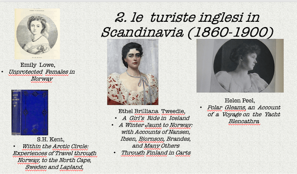 Ethel Brilliana Tweedie, la più assidua frequentatrice della Scandinavia, pubblica ben tre diversi resoconti. Il primo, A Girl’s Ride in Iceland, (La cavalcata di una ragazza in Islanda) fa scalpore proprio per il suo modo di cavalcare «come gli uomini» e non, come previsto al tempo, all’amazzone. A Winter Jaunt to Norway: with Accounts of Nansen, Ibsen, Bjornson, Brandes, and Many Others (Una gita invernale in Norvegia: con note su Nansen, Ibsen, Bjornson, Brandes, e Many Others) non si limita a narrare i suoi incontri con autorevoli esponenti della cultura norvegese, ma descrive anche la sua abilità di sciatrice, uno sport non ancora praticato dalle donne. Through Finland in Carts (Attraverso la Finlandia sui carri) riporta un viaggio avventuroso in un’area allora remota della Fennoscandia. La fama di questi resoconti permetterà all’autrice di diventare un’apprezzata scrittrice professionista.