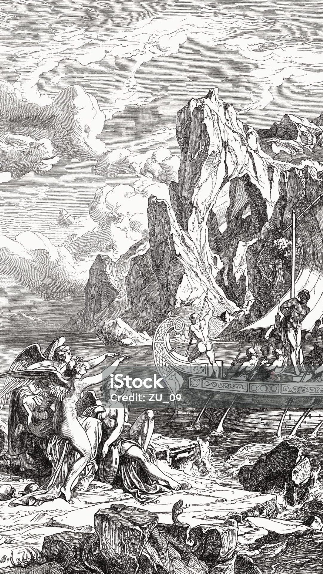 Nei versi di Apollonio Rodio, che nelle sue Argonautiche (IV 891-919) racconta il viaggio di Giasone e degli Argonauti alla ricerca del Vello d’Oro, troviamo una descrizione dettagliata di queste creature e dell’ambiente in cui si trovano. Giasone le incontrò dopo essere stato in Colchide, la leggendaria patria di Medea, situata sull’estremità orientale del Ponto Eusino, odierno Mar Nero. I marinai riuscirono a salvarsi grazie a Orfeo, che cominciò a suonare la lira così dolcemente da distrarli dal canto delle sirene, che si fermarono a loro volta per ascoltarlo. Omero non descrisse direttamente la fisicità delle creature marine, dando probabilmente per scontato che chi ascoltava o leggeva ne fosse già a conoscenza grazie al racconto di Apollonio.