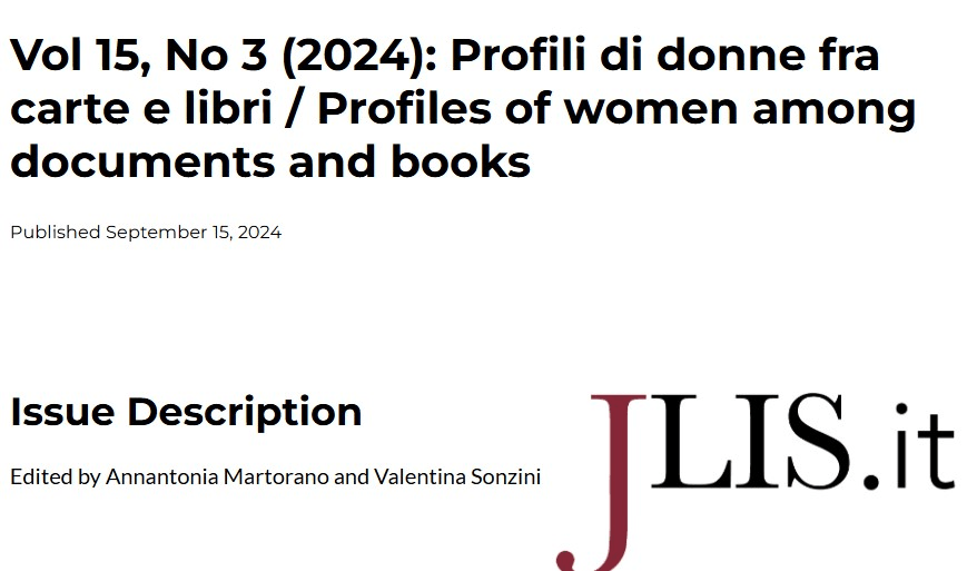 La rivista JLIS.it (Italian Journal of Library, Archives and Information Science), edita da Firenze University Press, nel numero 3 del settembre 2024 si è occupata di un tema che ci sta particolarmente a cuore: Profili di donne fra carte e libri, a cura di Annantonia Martorano e Valentina Sonzini. Non potevamo dunque ignorare le preziose informazioni che ne emergono, spesso rivelatrici di figure femminili semisconosciute o magari sottovalutate, visto che gli archivi e le biblioteche sono vere e proprie miniere in cui però bisogna scavare a fondo e rintracciare il filone giusto, nascosto talvolta fra carte che fanno capo a nomi maschili. Per darne conto è necessario iniziare dalla introduzione che meglio chiarisce il percorso portato avanti, non per nulla si intitola: Le ragioni di un ciclo al femminile. «Il taglio scelto per i sette interventi proposti dalle ricercatrici e dalle studiose che hanno aderito alla seconda edizione del progetto di Terza Missione promosso dal Dipartimento SAGAS dell’Università di Firenze, in collaborazione con la struttura di Ateneo “Unifi Include”, l’Archivio Storico del Comune di Firenze e l’Associazione culturale lucana di Firenze, è volto a rileggere, in chiave archivistica e biblioteconomica, i fondi librari e documentali di alcune donne protagoniste del nostro Novecento. Gli incontri registrati, inoltre, hanno trovato ospitalità in una playlist creata ad hoc dal Laboratorio multimediale dell’Università di Firenze nel canale Youtube Unifi-Convegni».