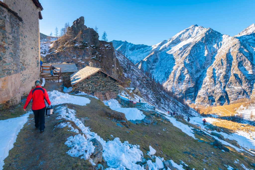 Proprio quando le due stagioni collimano, le genti della Valle Soana e della Valle di Cogne perpetuano l’antica tradizione della processione invernale al Santuario di San Besso, delizioso avamposto sito poco sopra i 2000 metri di quota nel Vallone di Campiglia, in uno degli angoli più suggestivi e selvaggi del versante piemontese del Parco Nazionale Gran Paradiso.