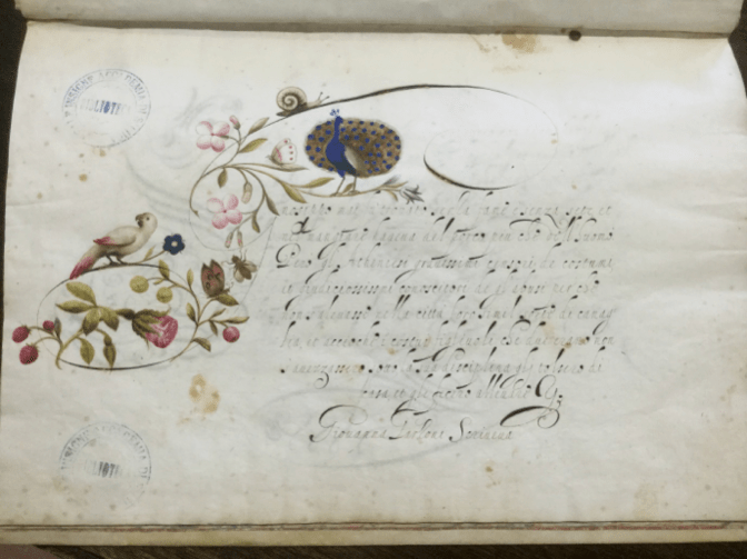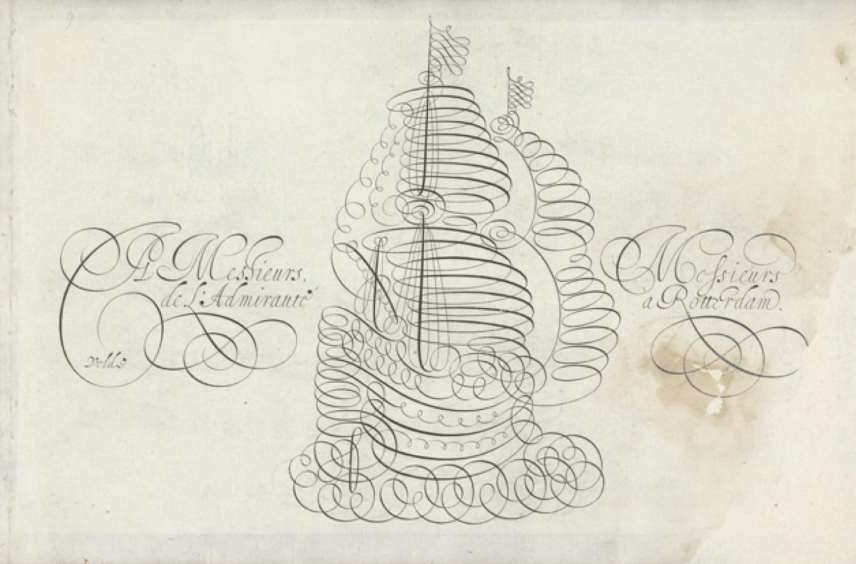 La dirompenza e la temerarietà — o meglio, la personale necessità e aspirazione — di valicare i confini di un’epoca che vedeva (nella maggior parte dei casi) le donne o suore o madri, si incarna in figure come quella di Giovanna Garzoni che decide di intraprendere una strada alternativa: il suo lavoro conta molte opere di diversa tipologia fra cui tele, stampe, miniature su pergamena e tessuti; divenne eccellente nella riproduzione di nature morte, senza tralasciare opere a carattere mitologico e ritratti. Questo ricco bagaglio di conoscenze e abilità affonda le radici in una fitta rete parentale e di amicizie; dopotutto della sua famiglia non si conosce molto ma ciò che è emerso ha portato alla luce dati rilevanti nell’ottica della formazione della miniaturista: sua madre proveniva infatti da una famiglia di orafi e le basi del disegno le furono impartite dallo zio Pietro Gaia, figura molto attiva ad Ascoli Piceno, e che a sua volta era stato seguace di Palma il Giovane, importante esponente della Scuola veneta. Garzoni, quanto la sua famiglia prima di lei fra Marche e Veneto, prese a viaggiare sin da giovane: una delle prime tracce la vede a Venezia prima dei trent’anni con suo fratello Mattio; durante questo soggiorno avrebbe seguito un corso di calligrafia di Giacomo Rogni dove compose il Libro de’ caratteri cancellereschi corsivi. Quest’opera ha la straordinaria capacità di rendere esplicita la relazione fra la calligrafia e i dipinti realizzati dalla pittrice cosmopolita: il volume tratta di un particolare stile calligrafico sviluppato in Italia, formato da lettere oblique ascendenti e discendenti e dalle linee sporgenti. Nel Libro si possono trovare testi di tipo religioso e storico, ma anche un epistolario che conta alcune lettere indirizzate a molteplici persone: vengono qui intrecciate le immagini a caratteri calligrafici, come è possibile notare nella resa grafica di una nave che spicca fra le pagine. Ed è proprio in tal caso che abbiamo la possibilità di vedere l’immensa sete di erudizione della calligrafa: in uno studio pubblicato da Aoife Cosgrove nell’anno accademico 2018/2019, la ricercatrice si focalizza sul documento ora preso in esame, cercando più notizie sull’educazione e sulla relazione di Garzoni con altre figure dell’epoca che potevano aver contribuito alla sua preparazione; oltre alla formazione con Rogni, Cosgrove evidenzia il legame con un calligrafo olandese di nome Jan van de Velde, detto il Vecchio: dall’attenta analisi della studiosa, troviamo, sul frontespizio di un pubblicazione nel 1605 del maestro, il disegno di una nave che appare incredibilmente simile a quello presente nel manuale di Garzoni.
