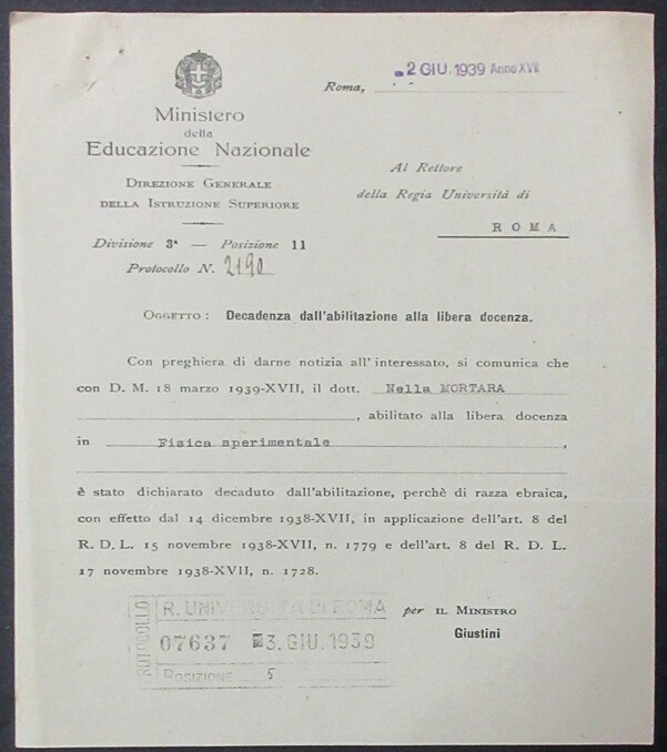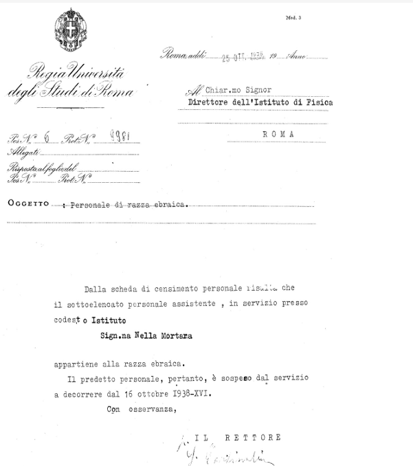 Il 16 ottobre dello stesso anno i professori ebrei presenti nei ruoli dello Stato furono letteralmente espulsi dalle scuole e dalle Università italiane. Fra loro c’era Nella Mortara, la prima donna italiana laureata in fisica sperimentale, l’unica ad avere un incarico stabile come docente universitaria.