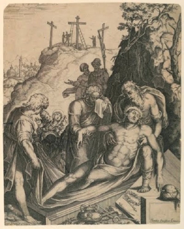 Oltre ai soggetti mitologici, Diana si dedicò anche a quelli sacri, trasferendo le opere di grandi artisti come nel caso dell’incisione che segue, sempre a bulino, in cui utilizzò La consegna delle chiavi di Raffaello Sanzio, reinterpretando liberamente lo sfondo.