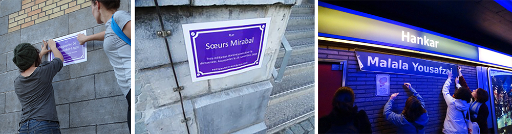 Uno dei principali strumenti per questa rivoluzione toponomastica è stato il lavoro del collettivo femminista Noms Peut-Être!, che dal 2017 si è impegnato per sensibilizzare l’opinione pubblica sull’invisibilità delle donne nello spazio urbano (in foto). Il loro progetto di installare targhe viola temporanee accanto ai cartelli stradali esistenti, e rinominare le stazioni metropolitane con nomi di donne celebri come Simone Veil, Rosa Parks e Malala Yousafzai, ha aperto un dibattito pubblico che ha spinto le istituzioni ad agire.