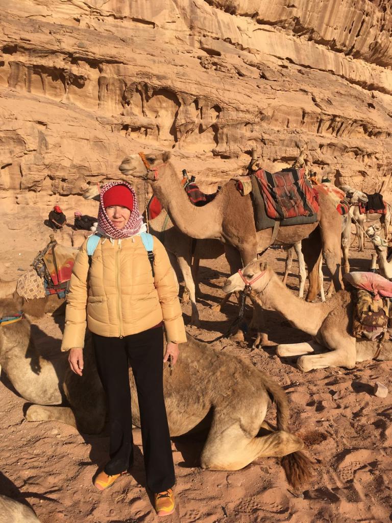 Il giorno seguente avevamo in programma la salita verso nord sulla strada che si inoltra nel deserto del Wadi Rum, detto anche Valle della Luna, patrimonio dell’umanità. È una valle, uadi, scavata nei millenni dallo scorrere di un fiume nel suolo sabbioso e di roccia granitica, a 60 km circa a est di Aqaba. La strada entra nella vallata desertica, con rare abitazioni con gruppi di dromedari assonnati qua e là, ma ecco all’improvviso, in lontananza apparire la vista di un vecchio treno a vapore inglese: quello di Lawrence d’Arabia, reso famoso dal film del 1962, che proprio in questa valle ha visto le principali riprese.