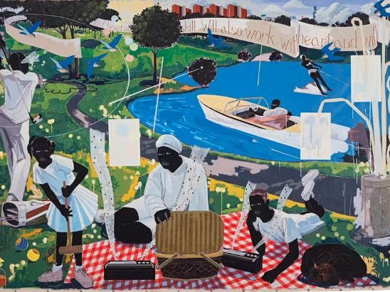 Molteplici sono anche i mezzi che usa Kerry James Marshall (Birmingham, 1955), come collage, graffiti e pittura, in potenti tele che sfidano gli stereotipi razziali. È diventato l’artista vivente nero più costoso nel 2018, quando il suo dipinto Past Times (1997) è stato venduto per 21,1 milioni di dollari da Sotheby’s. Rappresenta afroamericani che si divertono con attività ricreative, tra cui sci acquatico, croquet e golf. In primo piano alcuni soggetti stanno facendo un picnic. Sullo sfondo si vedono torri simili a quelle che si trovano nelle case popolari.